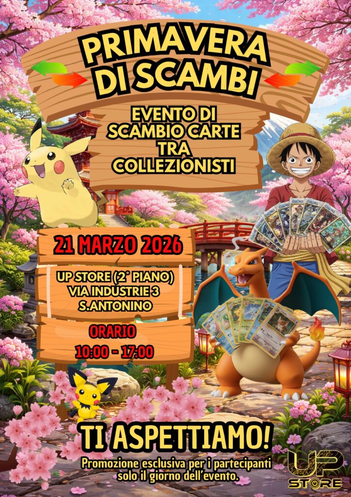 Dalle 10:00 alle 17:00, l’UP Store di S. Antonino si trasforma nel punto d’incontro perfetto per chi vive di carte, strategie e passione. Che tu sia alla ricerca della carta mancante o pronto a liberarti dei tuoi doppioni, questo è il posto giusto per fare affari (e magari qualche scoperta epica).