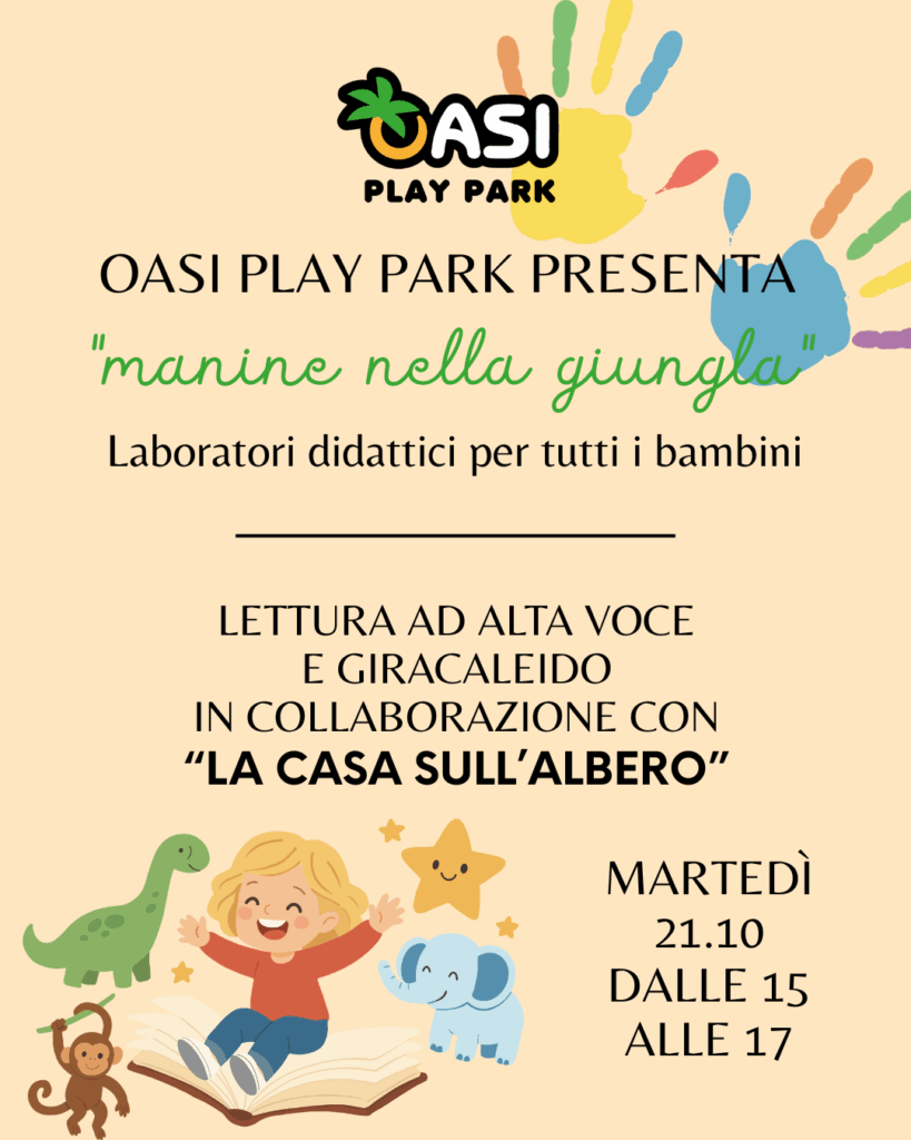 Martedì 21 ottobre, dalle 15:00 alle 17:00, i piccoli esploratori potranno vivere un’avventura speciale con “Manine nella Giungla” — i laboratori didattici pensati per stimolare fantasia e curiosità.