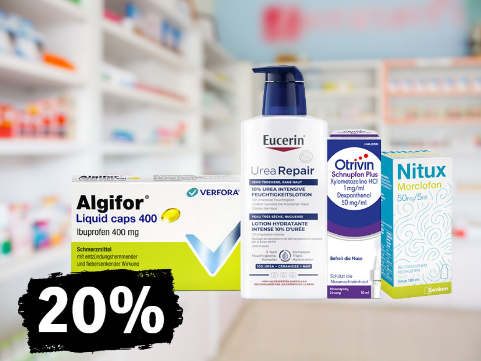 Nello sconto trovi tutto l’assortimento Algifor, Otrivin, Nitux sciroppo e la linea corpo Eucerin: un concentrato di salute, vitalità, cura e bellezza, disponibile nella tua farmacia Coop Vitality o comodamente online.